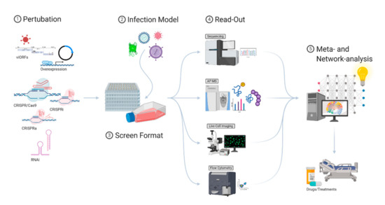 An extensive portfolio of genetic perturbation approaches (1) can be used to modify the protein expression levels to study the contextual function of specific gene products. With a suitable infection model system (2) (e.g., reporter viruses) and a fitting screening format (3), a large number of target genes can be studied on a large scale. Several different methods can then be used as a readout for gene/protein functionality (4). Different datasets can then be merged and fed into meta- and network-analysis algorithms (5). Gathering detailed insights from different experimental settings, a global picture of the innate immunity landscape can be drawn. It is critical to understand virus–host interactions in detail to develop novel antiviral drugs and treatments at the time they are needed.