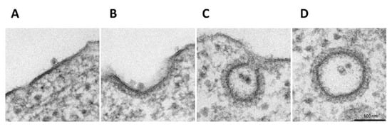 In order to investigate the H-1PV internalisation pathway, we performed EM analysis of HeLa cells infected with H-1PV. Infection was carried out at 4 °C for 1 h to allow virus cell surface binding. Cells were then shifted back to 37 °C for various intervals to allow virus internalisation. EM analysis of infected cells at 4 °C showed the virus at the cell surface bound to thickened regions resembling clathrin-associated plasma membrane (Figure 1A) []. In the first 5 min after cells were shifted back to 37 °C, the invagination of clathrin-rich regions started with H-1PV particles remaining associated with these regions (Figure 1B). From 10 to 30 min, viral particles were detected both in clathrin-coated pits (Figure 1C) or in the cytosol inside completely invaginated vesicles (we found up to nine particles in a single vesicle) (Figure 1D). Furthermore, in the course of the experiment, no virus internalisation was found in vesicles with the small flask-shaped invaginations that are characteristic of caveolae-mediated endocytosis [], which suggests that H-1PV is internalised mainly (if not exclusively) via clathrin-mediated endocytosis.