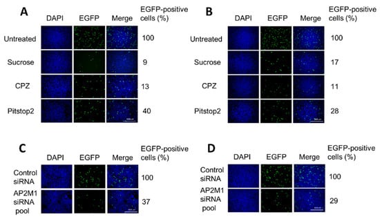 Blocking clathrin-mediated endocytosis results in a significant reduction of H-1PV transduction. (A) HeLa and (B) NCH125 cells were pre-treated with different clathrin-mediated endocytosis inhibitors (hypertonic sucrose, chlorpromazine (CPZ) or pitstop 2) or left untreated. Cells were then infected with recH-1PV-EGFP for 4 h in the presence of the inhibitor. At 20 h post-infection, cells were processed as described in the Materials and Methods (M&M) section. (C) HeLa and (D) NCH125 cells were transfected with a pool of siRNAs targeting either AP2M1 or negative control. At 48 h post-transfection, cells were infected with recH-1PV-EGFP for 4 h and grown for an additional 20 h. Cells were then processed as described in the M&M section. Numbers represent the average percentage of EGFP-positive cells relative to the number of EGFP-positive cells observed in untreated or scrambled siRNA-transfected cells, which was arbitrarily set as 100%.