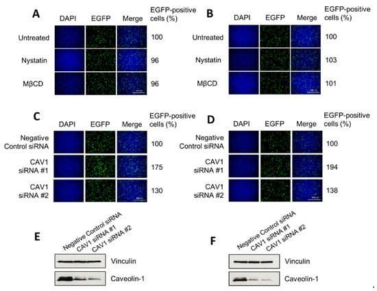 To investigate whether H-1PV uses pathways other than clathrin-mediated endocytosis to enter HeLa and NCH125 cancer cells, we inhibited clathrin-independent endocytosis using nystatin and methyl-β-cyclodextrin (MβCD). Both drugs selectively disrupt lipid rafts (e.g., cholesterol), including those required for caveolae-dependent entry [,,]. Yet, neither nystatin nor MβCD decreased H-1PV transduction, providing evidence that the virus does not use this endocytic route to enter these cells (Figure 4A,B). Similar results were also obtained using the two drugs at lower or higher concentrations (0.1–100 µg/mL for nystatin, 0.1–100 μM for MβCD). We also carried out siRNA-mediated knockdown of CAV1 (which encodes for caveolin-1) by using two different siRNAs. Knock-down of CAV1 gene expression did not decrease H-1PV transduction activity compared with scrambled siRNA-transfected cells, but instead increased it (Figure 4C,D). Together, these results indicate that caveolae-dependent endocytosis is not involved in H-1PV entry of HeLa and NCH125 cells.