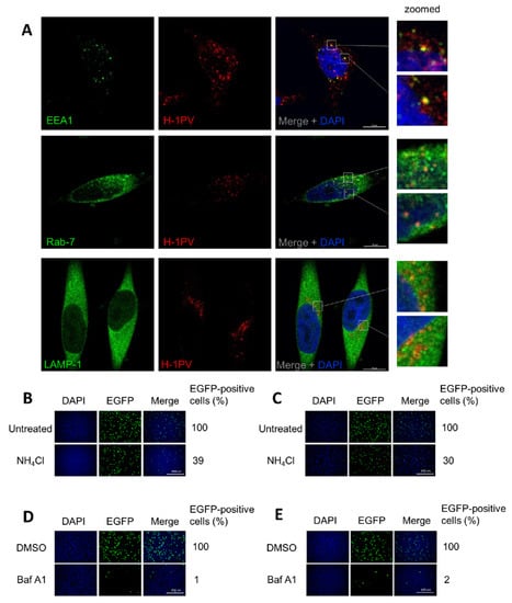 3.6. H-1PV Hijacks Endosomes for Trafficking into the Cytosol and Acidic pH Is Required for Productive H-1PV Infection