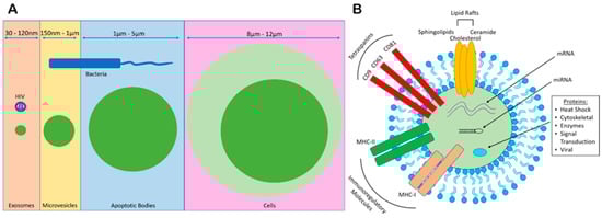 Size ranges of EVs and characterization. (A) Exosomes released when MVBs fuse with the PM are vesicles that range from 30–120 nm in diameter. Due to the similarity in size to viruses, exosomes are difficult to isolate from virus-infected blood. Microvesicles ranging from 150 nm–1 µm in diameter derive via shedding/budding from the PM surface. Apoptotic vesicles released from apoptotic cells range from 1 µm–5 µm in diameter. (B) Exosomes transport a variety of proteins and genetic material. Lipid raft-derived microdomains form larger domains responsible for inducing budding in an ESCRT-independent pathway of lateral cargo segregation. Exosomes are highly enriched with tetraspanins, which play a critical role in the ESCRT-independent pathway of endosomal sorting and function as exosome-defining surface markers. Depending on the cell of origin, exosomes may contain differing immunoregulatory molecules, such as MHC-I/II. Lastly, exosomes traffic a variety of host cell/viral protein, mRNA, and miRNA.