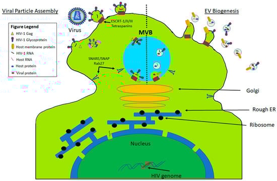 Comparison of viral and EV biogenesis. Infected cells concurrently release EVs and retroviral particles, possessing shared pathways at the MVB and the PM, whilst incorporating SNARE/SNAP Rab27 and tetraspanins, and ESCRT proteins in both pathways [1]. Depicted here is: sorting and transport of the exosome-specific proteins to the nascent ILVs, and excision from the MVB, Gag-mediated virion assembly at the PM or the MVB, and EV and virion release, [1,3].