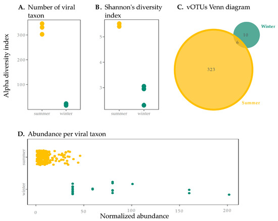 Viral sample richness (within sample diversity) and taxa abundance in summer and winter surface samples from SAS2A. Diversity results are presented using the (A) number of viral taxa present (presence of a viral operational taxonomic unit (vOTU)) and (B) the Shannon diversity index (to account for evenness). Summer samples had significantly higher diversity in terms of the number of viral taxa (A) but the difference between seasons was not significantly different for the Shannon Index (B) (p > 0.05). (C) We also present a Venn diagram for vOTUs found in summer and winter, showing there is little overlap between seasons (6 vOTUs, 1.7%). (D) Abundance per viral taxon is greater in the winter, with a few taxa dominating the community, supporting observations from Shannon’s diversity index (B).