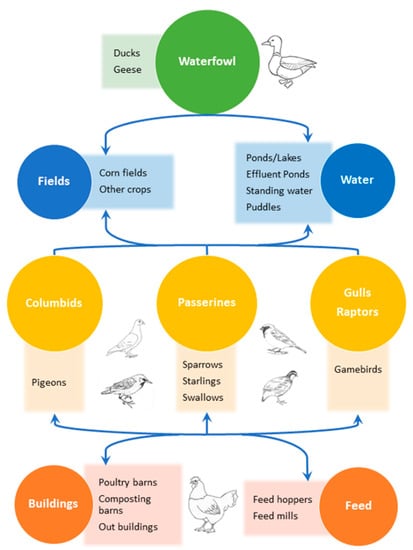 A useful concept for characterizing the potential role synanthropic species might play in IAV dynamics at the wildlife–agricultural interface is the idea of bridge hosts [1,9]. Bridge hosts can be defined as non-maintenance host species capable of transmitting a pathogen from a reservoir population to a target population. Maintenance hosts for IAVs are water birds (ducks, geese, shorebirds), the target population is poultry (chickens, turkeys, gamebirds), and bridge hosts are species commonly observed both in poultry facilities and nearby habitats for maintenance hosts (Figure 1). For example, bridge hosts might share water (riparian habitat, ponds, drainages) or foraging resources (e.g., crop fields) with maintenance hosts, and water (swales, puddles, canals) or foraging (spilled feed, carcasses) resources on farms. IAVs could be transmitted between host types either by direct contact or indirect contact by mechanical spread or resource contamination. Synanthropic species are likely to occupy habitats shared by both maintenance and target hosts, so evaluating what is known about IAVs in these species sheds light on the risks they may pose as bridge hosts. In this review, we systematically review what is known about IAV exposure and infection dynamics for synanthropic species in each of the relevant order of birds.