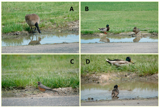 (A) Canada goose, (B) mallard, (C) American robin, (D) European starling (mallard in background) all sharing the same puddle over a short period of time.