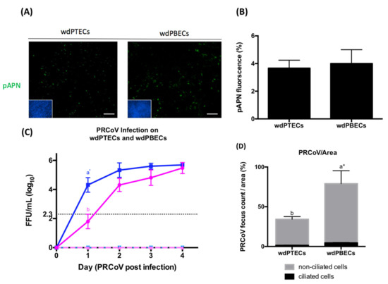 PRCoV replicates predominantly in the lungs and is mostly detected in the lower respiratory tract [21]. First, we applied immunofluorescence microscopy to visualize the expression of pAPN and used ImageJ to quantify the amount of expression of pAPN on wdPTECs and wdPBECs. The result is shown in Figure 5A,B. This result indicates that there is no significant difference between wdPTECs and wdPBECs in the expression of pAPN. To compare the replication efficiencies of PRCoV, in wdPTECs and wdPBECs, filter-grown ALI cultures were inoculated apically with PRCoV. The cell supernatants were collected from the apical and basal filter compartment at 0, 1, 2, 3, and 4-day-post-infection (dpi), respectively, and analyzed for the presence of an infectious virus. As shown in Figure 5C–E, compared to the wdPTECs, PRCoV replicated more efficiently in wdPBECs. At one-day post-infection, the infectivity determined in the supernatant of the bronchial cells was about 100-fold higher compared to the value of tracheal cells. At later time points, the differences between the virus titers continuously decreased. At 4 dpi, the amounts of infectious virus determined in the supernatants were almost the same for both wdPTECs and wdPBECs. The preferential infection of non-ciliated cells reported above (Figure 2C) was also observed with wdPBECs (Figure 5D).