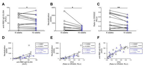 The capacity of convalescent plasma to bind to the S glycoprotein of SARS-CoV-2 and neutralize pseudoviral particles decreases over time. Convalescent plasma samples recovered six (black circle) and ten (blue triangle) weeks after symptoms onset from fifteen individuals were used for (A) anti-SARS-CoV-2 RBD IgG ELISA, (B) neutralization against pseudoviral particles expressing the SARS-CoV-2 S glycoprotein, and (C) virus capture assay (VCA). (A) Anti-RBD antibody binding was detected using anti-IgG-HRP. Relative light units (RLU) obtained with BSA (negative control) were subtracted and further normalized to the signal obtained with the anti-RBD CR3022 mAb present in each plate. The areas under the curve (AUC) were calculated based on RLU using GraphPad Prism software. AUC below threshold (dashed line) was considered no binding. (B) Neutralization half-maximal inhibitory plasma dilution (ID50) was determined using a normalized non-linear regression using Graphpad Prism software. (C) VSV-G-pseudotyped viral particles expressing the SARS-CoV-2 S glycoprotein were added to plates coated with plasma samples. Free virions were washed away, and Cf2Th cells were added to the wells. After 48 hours, cells were lysed, and the luciferase activity was measured. Luciferase signals were normalized to those obtained with the RBD-specific CR3022 antibody. Data shown are the mean ± SD of three independent experiments performed in triplicate. Statistical significance was evaluated using a paired t-test (*, p < 0.05, **, p < 0.01). Correlations between (D) neutralization and anti-RBD IgG ELISA, (E) neutralization and VCA, and (F) anti-RBD IgG ELISA and VCA were calculated. Correlations for samples recovered six weeks (in black) and ten weeks (shown in blue) post symptoms onset are shown. Statistical significance was established with the Spearman rank correlation test (***, p < 0.001, ****, p < 0.0001).