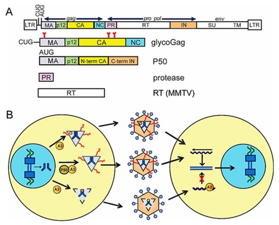 - Stavrou, S.; Nitta, T.; Kotla, S.; Ha, D.; Nagashima, K.; Rein, A.R.; Fan, H.; Ross, S.R. Murine leukemia virus glycosylated Gag blocks apolipoprotein B editing complex 3 and cytosolic sensor access to the reverse transcription complex. Proc. Natl. Acad. Sci. USA 2013, 110, 9078–9083. [Google Scholar] [CrossRef]