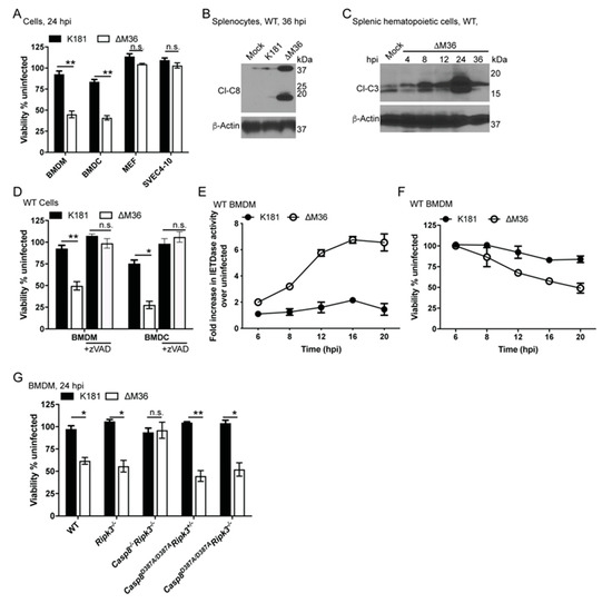 Caspase (CASP)8 activity is required for ∆M36-induced apoptosis. (A) Relative viability of bone marrow-derived macrophages (BMDM), bone marrow-derived dendritic cells (BMDC), murine embryonic fibroblasts (MEF), and SVEC4-10 cells infected for 24 h (h) with K181 or ∆M36 at MOI = 10. Relative viability was assessed with respect to parallelly maintained uninfected cells. All viability data are from 2 to 5 independent experiments. (B,C) Immunoblot (IB) for activated cleavage products of CASP8 (Cl-C8, 18 kDa) (B) and CASP3 (C) (Cl-C3; 22 and 19 kDa) in splenocytes (B) or splenic hematopoietic cells (HC; C) from mice infected with K181 or ∆M36 at indicated hours post-infection (hpi). IB are representatives of data obtained from 10 to 12 mice in 3 to 5 independent experiments for either B or C. (D) Relative viability of BMDM and BMDC cells at 24 hpi with K181 or ∆M36 in the absence or presence of zVAD-fmk (25 μM). The drug was added 1 hpi with virus and maintained till the end of the assay. E and (F) CASP8 activity on substrate sequence isoleucine-glutamine-threonine-aspartic acid (IETD) (E) and relative viability (B) of infected wild type (WT) BMDM from 6 through 20 hpi. (G) Relative viability of BMDM at 24 hpi when indicated genotypes were infected with K181 or ∆M36. Graphs show pooled data from 3 to 5 experiments for each condition. Lines above bars indicate the two groups compared for significance values using paired, parametric Student’s t-test where * is <0.05, ** is <0.01, and n.s. represents nonsignificant.