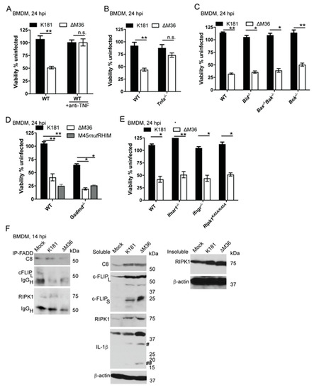 Tumor necrosis factor (TNF) drives ∆M36-dependent apoptosis in BMDM. (A) Relative viability of WT BMDM infected with K181 or ∆M36 (MOI = 10) for 24 h in the absence or presence of neutralizing anti-TNF (100 μg/mL). anti-TNF was added in medium 1 hpi. (B–E) Relative viability of mutant BMDM when compared to WT cells at 24 hpi with indicated viruses. Viability graphs reflect data pooled from 3 to 5 independent experiments each containing 3 replicates. (F) IB showing the association of CASP8 (C8; 55 kDa), cellular FLICE inhibitory protein (cFLIP) (full length 55 kDa, indicated as cFLIPL) and RIPK1 (75 kDa) with Fas-associated via death domain (FADD) when Triton-X solubilized cell lysates from K181- or ∆M36-infected WT BMDM were subjected to immunoprecipitation at 14 hpi using anti-FADD antibody (left panel). Immunoglobulin (IgG) heavy chain (IgGH; 50 kDa) was detected when membranes were incubated with either anti-cFLIP or RIPK1 antibodies. Middle panel indicates total levels of C8, cFLIPL, as well as cFLIP short (cFLIPS; 25 kDa), RIPK1, and IL-1β with both total (#; 31 kDa) and processed forms (##; 17 kDa) were detected in the soluble cell lysates. Right panel indicates RIPK1 level in the detergent-insoluble fraction. β-actin (38.5 kDa) serves as loading control. IB data are representative of 3 independent experiments. Lines above bars indicate the two groups compared for significance values using paired, parametric Student’s t-test where * is <0.05, ** is <0.001, and n.s. represents nonsignificant.