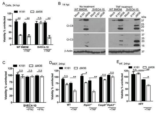 TNF drives ∆M36-dependent apoptosis in endothelial cells and fibroblasts. (A). Relative viability of WT BMDM and SVEC4-10 cells infected with K181 or ∆M36 (MOI = 10) for 24 h in the absence or presence of murine TNF (25 ng/mL). TNF was added to medium 1 hpi. Graph reflects data pooled from three independent experiments, each containing 3 replicates. (B). IB showing the appearance of Cl-C8 and Cl-C3 with loading control β-actin 14 hpi in WT or SVEC4-10 cells under indicated conditions. Data are representative of 2 independent experiments. (C–E). Relative viability of SVEC4-10 treated with no cytokine, murine IFNβ or IFNγ (100 ng/mL each), (C), MEFs of indicated genotypes treated with murine TNF (25 ng/mL) (D) or HF treated with human TNF (100 ng/mL) (E) and infected with K181 or ∆M36 (MOI = 10) at 24 hpi. All cytokines were added to the medium at 1 hpi with virus. C-E reflect data pooled from two independent experiments, each containing 3 replicates. Lines above bars indicate the two groups compared for significance values using paired, parametric Student’s t-test where * is <0.05, ** is <0.01, and n.s. represents nonsignificant.