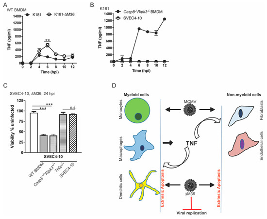 Macrophage-derived TNF drives ∆M36-dependent apoptosis in endothelial cells. (A,B). TNF quantities in supernatant collected from K181- or ∆M36-infected (MOI = 10) WT BMDM (A) and Casp8−/−Ripk3−/− BMDM or SVEC4-10 cells infected with K181 (MOI = 10) (B) over the indicated time course. Graphs reflect data pooled from one ELISA experiment analyzing data from 3 independent infection experiments each containing 2 replicates for all conditions. (C). Relative viability of untreated SVEC4-10 cells infected with ∆M36 (MOI = 10) for 24 h and in absence or presence of supernatants collected at 6 hpi from ∆M36-infected BMDM (WT, Casp8−/−Ripk3−/− or Tnfa−/−) or SVEC4-10 cells. Untreated SVEC4-10 cells were infected for 1 h and then media or supernatants were added. Data are from one experiment with 3 replicates. (D). Model for MCMV and vICA mutant infection of myeloid (monocytes, macrophages, or dendritic) cells and non-myeloid (fibroblasts or endothelial cells). TNF is produced by myeloid cells that kill myeloid cells in an autocrine loop and non-myeloid cells in a paracrine loop. Lines above bars indicate the two groups compared for significance values using paired Student’s t-test where ** is <0.01, *** is < 0.001, and n.s. represents nonsignificant.