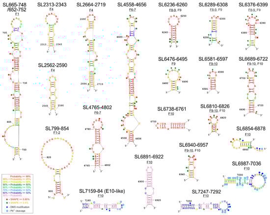 The structure of the 288 nt F9 molecule with the lowest energy, ΔG = −120.4, contains five interesting motifs, representing a highly probable RNA secondary structure (SL6236-6260, SL6289-6308, SL6376-6399, SL6476-6495, and SL6689-6722) and one less probable one, SL6581-6597 (Figure S1F). Closest to the 5′ end of the F9 molecule, a regular hairpin structure was proposed, called SL6236-6260 (Figure 2). There are nucleotides with a high degree of reactivity in both the loop and stem. Another motif is the SL6378-6395 hairpin, common with the F8–9 fragment (Figure 2 and Figure S1E,F). A third hairpin structure, SL6581-6597, has a lower probability of occurrence in this fragment than the other structures, but it is highly probable in F9–10 (Figure 2 and Figure S1F,G).