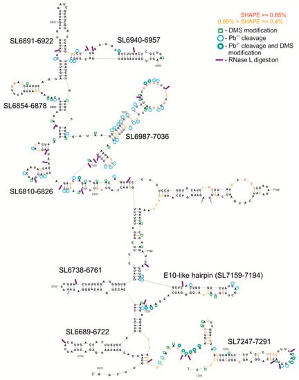 For the F9–10 molecule, a 587 nt fragment was experimentally mapped. This fragment has 127 nucleotides shared with F9 and contains the overlapping F10 region, examined with the 9–10R primer. RNAstructure predicted the structure model F9–10, with a free energy of ΔG = −64.0, which contains four highly probable motifs. The region SL6581–6597 forms a short, simple hairpin also observed within the overlapping fragment F9 (Figure 2 and Figure S1F,G). It is predicted with higher probability in the F9–10 RNA. Another motif is the hairpin SL6689-6722 with an additional two internal loops in the stem (shared with F9, Figure S1F). Two further structural motifs, SL6940-6957 and SL6810-6826, have less complex structures, each of which consists of a simple hairpin with or without a mismatch inside the stem, respectively. Each of the three latter elements is present also in the F10 RNA (Figure 3 and Figure S1H).