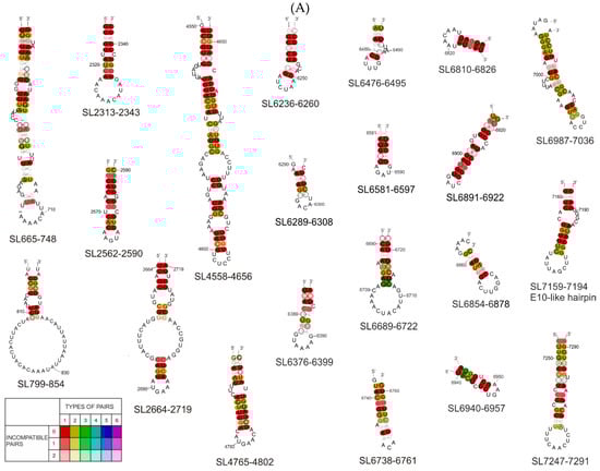 The fragments F1, F1–2, and F10 are known to contain complex autonomous structures, which were omitted for better structure modeling of the remainder of the sequences. For F1 and F1–2, the excluded domain was a part of the IRES elements [22]. In the case of F10 it was a 3′-terminal pseudoknot [23]. In each analyzed fragment, the well-defined, highly probable structural elements were identified. The RNAstructure program analyzes the probability of a particular structural motif being formed, which greatly aided the identification of the conserved elements. The analysis is based on the probability of each nucleotide position being double- or single-stranded in the different structural models of a RNA fragment. In Figure 2 (and SM1) this probability is depicted by the different colors of the nucleotides, according to the legend.