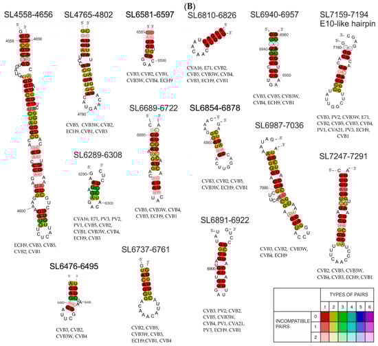 (A) Consensus secondary structures generated by the RNAalifold program for particular RNA motifs identified in the coding part of the Coxsackie B3 virus genome, the “Nancy” strain and 19 other CVB3 strains/isolates. The colors indicate structural conservation according to the key in the figure. (B) Consensus secondary structures generated by RNAalifold program for particular RNA motifs identified in the coding part of the Coxsackie B3 virus genome, the “Nancy” strain and some of 11 other enterovirus strains we investigated. (CVA16-U05876.1|CAU05876 coxsackievirus A16 G-10; CVA21-D00538.1|CXA21CG Human coxsackievirus A21 (strain Coe); CVB1-M16560.1|CXA1G Coxsackievirus B1; CVB2-AF085363.1|Coxsackievirus B2 strain Ohio-1; CVB3-JX312064.1|Human coxsackievirus B3 strain Nancy; CVB3W-U57056.1|CXU57056 Coxsackievirus B3 Woodruff variant; CVB4-X05690.1|Coxsackievirus B4; CVB5-X67706.1|Coxsackievirus B5; PV1-K01392.1|POL3L37 Poliovirus P3/Leon/37 (type 3; PV2-X00595.1|Poliovirus type 2 genome (strain Sabin 2); PV3-V01150.1|Human poliovirus strain Sabin 1; ECH9-X84981.1|Echovirus 9 (strain Hill); E71-AF176044.1|Enterovirus 71.) The colors indicate structural conservation according to the key in the figure.