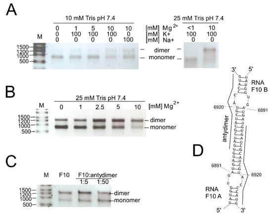Dimerization of the F10 RNA, the 3′-terminal region of the CVB3 genome. (A) Impact of ionic and buffer concentrations; (B) impact of divalent magnesium ions on dimerization process; (C) inhibition of homodimer formation in the presence of “antydimer” (DNA 18-mer), complementary to the F10 in the region of the potential dimerization site; and (D) computer predictions of the region responsible for F10-homodimer formation.