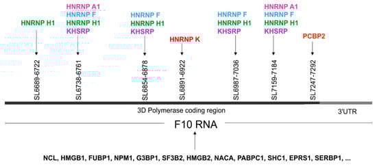 The proteins identified in the RNA-centric affinity chromatography that were found to be interacting with F10 RNA fragment from the 3′-terminus of the CVB3 genome. Possible localizations of the RNA–protein interactions for several proteins is given, based on the presence of a predicted sequence binding site (ATtRACT database) within the F10 sequence. The figure shows the gene names rather than full protein names to minimize the space required. Different colors represent distinct proteins.