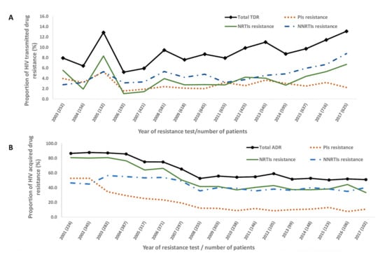 - Schmidt, D.; Kollan, C.; Fätkenheuer, G.; Schülter, E.; Stellbrink, H.J.; Noah, C.; Jensen, B.-E.O.; Stoll, M.; Bogner, J.R.; Eberle, J.; et al. Estimating trends in the proportion of transmitted and acquired HIV drug resistance in a long term observational cohort in germany. PLoS ONE 2014, 9, e104474. [Google Scholar] [CrossRef][Green Version]