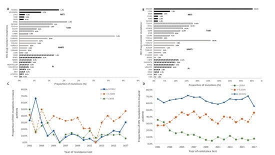 - Franzetti, M.; Violin, M.; Antinori, A.; De Luca, A.; Ceccherini-Silberstein, F.; Gianotti, N.; Torti, C.; Bonora, S.; Zazzi, M.; Balotta, C. Trends and correlates of HIV-1 resistance among subjects failing an antiretroviral treatment over the 2003–2012 decade in Italy. BMC Infect. Dis. 2014, 14, 398. [Google Scholar] [CrossRef]
