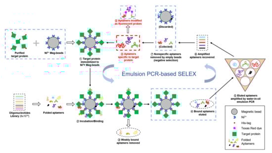 - Shao, K.; Ding, W.; Wang, F.; Li, H.; Ma, D.; Wang, H. Emulsion PCR: A high efficient way of PCR amplification of random DNA libraries in aptamer selection. PLoS ONE 2011, 6, e24910. [Google Scholar] [CrossRef]