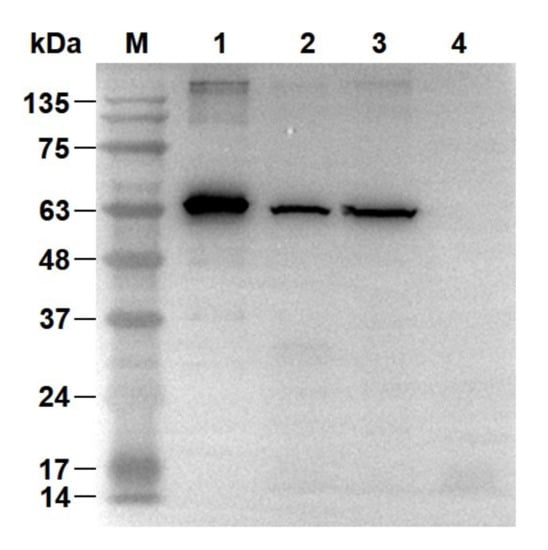 A variety of fusion tags to the RBSDV P10 protein were screened for expression (Figure S1A,B). A plasmid construct of the RBSDV His-P10 protein expressed in E. coli BL21-CodonPlus (DE3)-RIPL cells was selected. A band about 65 kDa was visible after induction with IPTG. The expressed protein size was consistent with the calculated molecular weight of 65.3 kDa (Figure S2A). The RBSDV His-P10 protein purified by IMAC was analyzed by SDS-PAGE and CBB-R250 staining. The results showed that there were no other visible protein bands (Figure S2B). The Western blot was also carried out to confirm the identity of the purified His-P10 protein using the anti-RBSDV P10 mAB. The purified expressed RBSDV P10 protein was used as a positive control. The membrane and cytosolic protein fractions of the RBSDV-infected SBPH were successfully detected. No band was detected in the negative control (Figure 2). These results confirmed the identity of the purified RBSDV His-P10 protein.