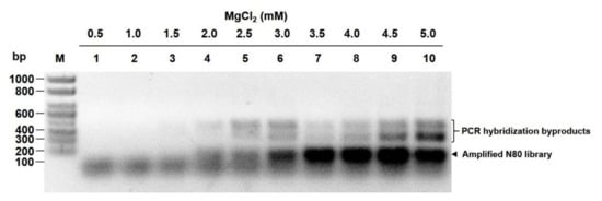 After the optimization of ePCR parameters, the N80 ssDNA library was successfully amplified by ePCR with 3.5 to 4 mM MgCl2 (Figure 3) with the least hybridization byproducts formed and the optimal concentration of BSA in ePCR was confirmed to be in the range of 0.01 to 0.1 mg/mL (Figure S3B).
