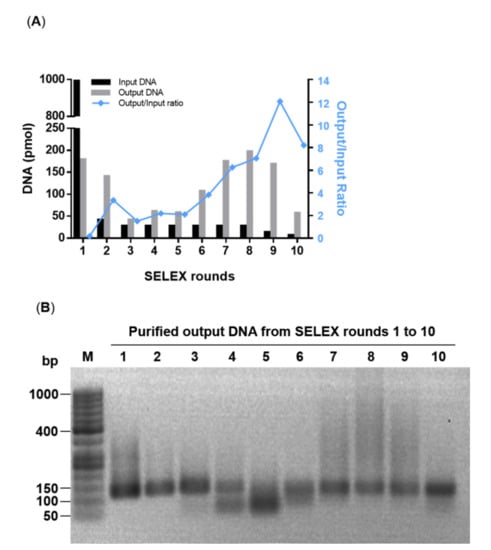 A close monitoring of the output DNA yield and the output/input DNA ratio during SELEX provided valuable information on the enrichment of putative aptamers and standardized the whole screening process. In a typical SELEX process, putative aptamers are enriched when the output/input DNA ratio first declines and then starts to increase with an output DNA yield of more than 3 μg, despite continuously increased stringency parameters throughout SELEX rounds. In this study, these stringency parameters were adjusted based on the monitoring of the output/input DNA ratio to favor the enrichment of high affinity aptamers, while ensuring adequate output yield of DNA from ePCR in each round.