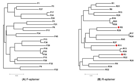 Phylogenetic analyses of F-aptamers and the R-aptamers were made by ClustalW in MEGA5 software and showed that putative aptamers enriched from the N80 ssDNA library were very diverse (Figure 5). It indicated that the ssDNA library used to generate aptamers for selection is sufficiently complex. A library of 1 nmol (6.02 × 1014) random ssDNA aptamers was large enough to generate sufficient putative aptamers against the RBSDV His-P10 protein from the emulsion PCR-based SELEX screening.