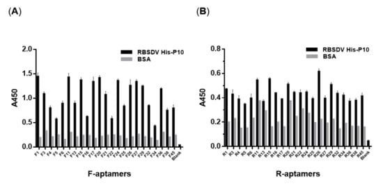 A total of 46 biotinylated aptamers, containing 23 F-aptamers and 23 R-aptamers, were synthesized based on the 23 TA-cloned constructs from round 10. The biotinylated aptamers were used to detect the RBSDV His-P10 protein coated in bottom wells of the ELISA plate by the enzyme-linked oligonucleotide assay (ELONA). The wells coated by BSA were used as the negative controls. The detection results were measured by reading the absorbance at 450 nm filter after the TMB-HRP reaction. The sensitivity of aptamer binding to the RBSDV His-P10 protein was positively correlated with the signal intensity (black bars) which represented the relative amount of aptamers bound to the His-P10 coated wells (Figure 6A,B). The affinity of selected aptamers varied and the affinity of F-aptamers was higher than that of R-aptamers. The A450 nm of P10/BSA ratio varied between 1.26 (aptamer R13) and 7.55 (aptamer F17), suggesting that the specificities of these 46 putative aptamers were different. The comparison between F-aptamers to the RBSDV His-P10 protein and R-aptamers to the RBSDV His-P10 protein suggested that aptamers synthesized based on the forward strands gained more affinity to the RBSDV His-P10 protein than aptamers generated from the reverse strands.