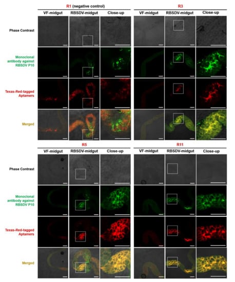 Detection of the RBSDV P10 in the midgut of RBSDV-infected small brown planthoppers (SBPH) using the RBSDV P10 protein monoclonal antibody and Texas-Red-tagged aptamers R1 (negative control), R3, R5 and R11. The localization of RBSDV P10 by the anti-P10 monoclonal antibody with the FITC-conjugated rabbit anti-mouse IgG and Texas-Red-tagged aptamers R1 (negative control), R3, R5 and R11 in RBSDV-free and RBSDV-infected SBPH midguts are presented in green and red signals, respectively. Bar = 100 μm.