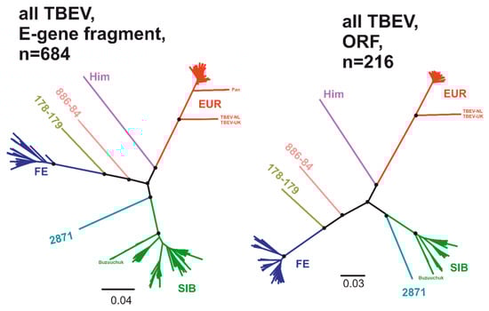 Unrooted maximum likelihood tree for Tick-borne encephalitis virus (TBEV; E gene fragment—left panel, complete open reading frame (ORF)—right panel). Black circles indicate high-level nodes that were supported by UFBoot values over 95% [36]. The scale bar and branch lengths represent the expected number of substitutions per site.