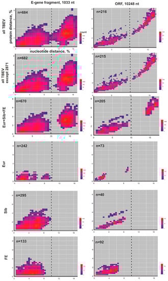 Heatmap of concordance between nucleotide and amino-acid pairwise distances in E gene fragments (left panels) and ORF (right panels). First panel: all TBEV sequences. Second panel: all TBEV sequences except “2871” group viruses. Third panel: three major TBEV subtypes. The three bottom panels demonstrate the distribution of intrasubtype virus pairs for TBEV-Eur, TBEV-Sib, and TBEV-FE. Axes show uncorrected amino-acid and nucleotide sequence distances; dots correspond to distances between each possible pair of sequences in the dataset. Color indicates the density of dots according to the scale bar. The dotted line at 10% nucleotide difference indicates the proposed threshold for the division of TBEV species into subtypes.