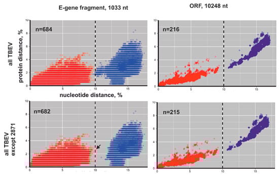 Across all TBEV sequences (three major types and novel provisional subtypes), intersubtype nucleotide distances were above the 10% threshold (dotted line at Figure 2 and Figure 3), whereas intrasubtype virus pairs were below. This pattern was observed both for full ORF sequences and for the E gene fragment. In the latter case, the separation was not ideal, but the overlap between inter- and intrasubtype distances was produced solely by two “2871” group representatives. Omitting them resulted in clear segregation of inter- and intrasubtype distances, even in the E protein fragment (two upper panels at Figure 2 and Figure 3).