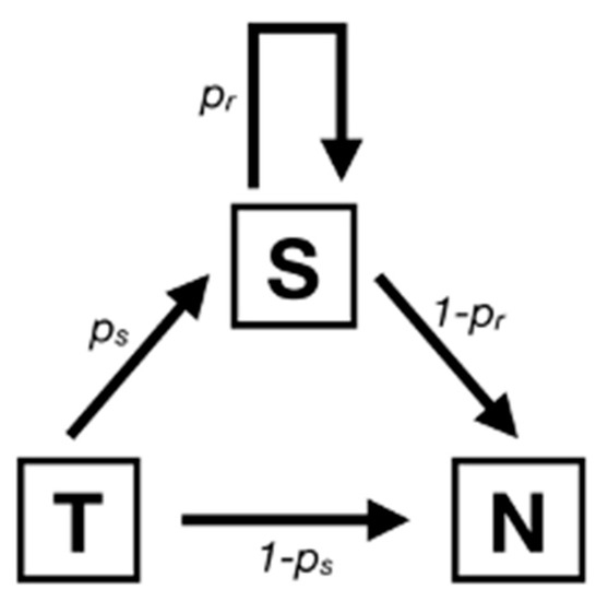 To describe the process of polymerase stuttering, we implemented a Markov model (Figure 1) with three possible states: transcribe (T), next (N), and stutter (S). In normal conditions, the polymerase would proceed from the state T where it just transcribed a base to the state N, where it would transcribe the next base. In our model, this transition happens with probability . The system goes in a stuttering state (S) with probability . This means that the same guanine base is transcribed once more, resulting in a single insertion. The polymerase can then stutter again with a different probability pr or the polymerase might move to the next base, ending up in the absorbing state N (corresponding to the transcription of the rest of the sequences) with probability 1 − pr. After the first time, the polymerase can stutter any number of times, each time with probability pr.