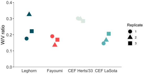 The W/V ratio is not affected by the unknown contribution from genomic RNA. The values of W/V are in the range of 0.14 to 0.33, with a mean of 0.22, median of 0.2, and SD of 0.07 (Figure 2). Values from in vivo infections are not dissimilar to the ones from in vitro infection of the same LaSota strain but differ significantly from the ones of the virulent Herts/33 strain (Table 3).