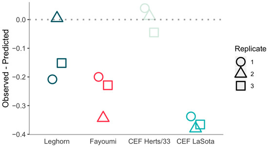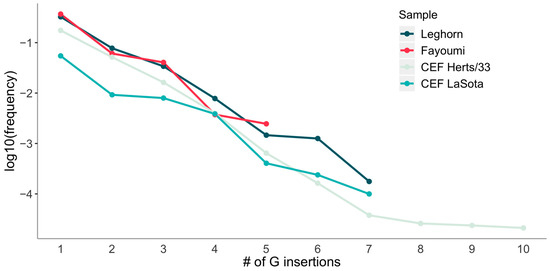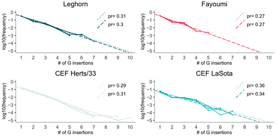We also note a systematic deviation from the model. While double insertions +GG closely follow the trend described by the model for Herts/33 infections in CEF cells, the scenario is different for all LaSota samples. In all LaSota infections but one, +GG insertions appear to be underrepresented with respect to the predictions of the model. We reanalysed the stuttering profile ignoring +GG insertions and compare their fraction with the predicted one in Figure 5.