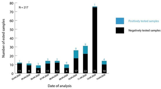 Number of positively confirmed samples analyzed at the Centre d’Infectiologie Charles Mérieux du Mali between 3 April 2020 and 14 April 2020. Patient samples tested on April 13 represent screened passengers of a return flight from Tunisia. Residual samples reflect suspected cases from Bamako and its surrounding regions. Samples containing the E and RdRp genes were confirmed as positive.