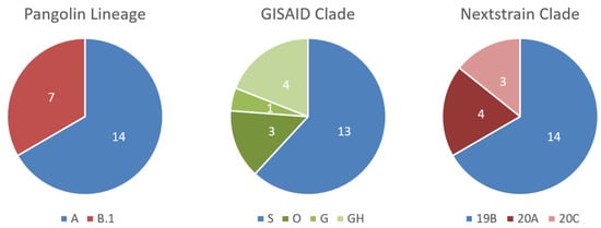 - Freunde von GISAID, e.V. Clade and Lineage Nomenclature Aids in Genomic Epidemiology Studies of Active hCoV-19 Viruses. Available online: https://www.gisaid.org/references/statements-clarifications/clade-and-lineage-nomenclature-aids-in-genomic-epidemiology-of-active-hcov-19-viruses/ (accessed on 22 July 2020).