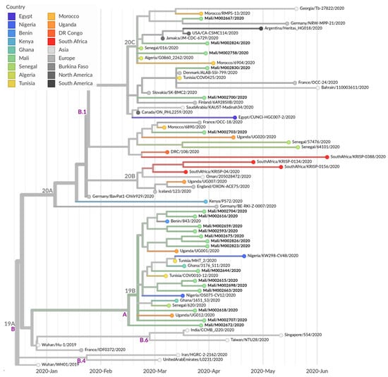 In contrast, the B.1 lineage is comprised of sequences associated with the large Italian outbreak in February 2020 and represents, to date (current as of date 21 July 2020), together with its sublineage B.1.1, the worldwide prevalent virus clade []. The African continent, especially South Africa, is dominated by lineages B (its origin still lying in Asia) and B.1 []. In Mali, only one-third of the patient samples were assigned to lineage B.1, thus giving rise to speculation that this viral lineage was imported at a later point in time. As the nearest neighbors of our Malian genomes belong to the B.1 lineage and are geographically spread out (Europe, United States, Canada and Northern Africa), we can exclude a single event as the origin of introduction of the B.1 lineage into Mali. More likely, multiple travel-associated transfers from various countries have caused the spread of the B.1 lineage within Mali. Unfortunately, restrictive measures in order to contain the circulation within Mali are only possible to a limited extent, since social distancing measures endanger vital income for survival and are hence not fully feasible.
