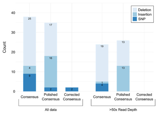 - Loman, N.J.; Quick, J.; Simpson, J.T. A complete bacterial genome assembled de novo using only nanopore sequencing data. Nat. Methods 2015, 12, 733–735. [Google Scholar] [CrossRef]