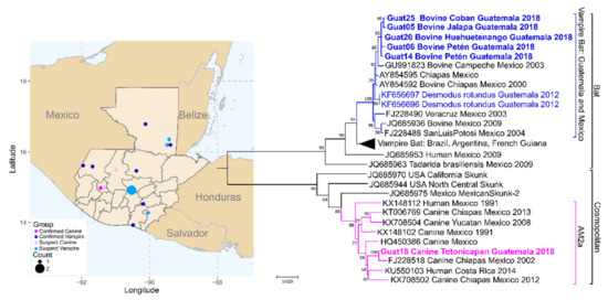 - Ellison, J.A.; Gilbert, A.T.; Recuenco, S.; Moran, D.; Alvarez, D.A.; Kuzmina, N.; Garcia, D.L.; Peruski, L.F.; Mendonca, M.T.; Lindblade, K.A.; et al. Bat rabies in Guatemala. PLoS Negl. Trop. Dis. 2014, 8, e3070. [Google Scholar] [CrossRef]
