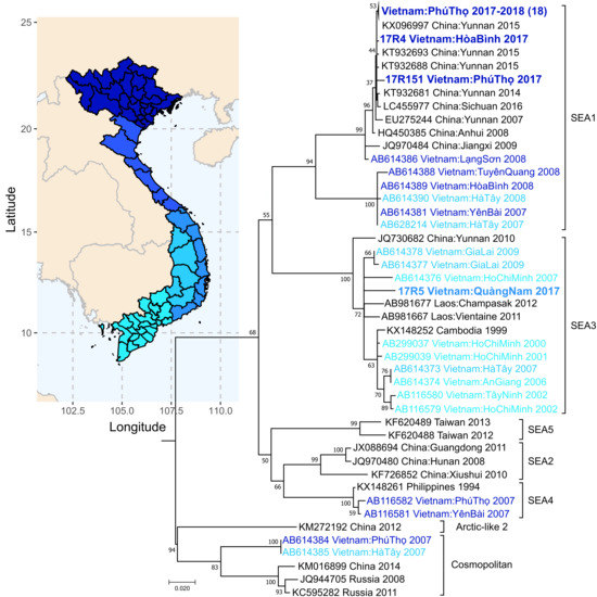 - Nguyen, A.K.; Nguyen, D.V.; Ngo, G.C.; Nguyen, T.T.; Inoue, S.; Yamada, A.; Dinh, X.K.; Nguyen, D.V.; Phan, T.X.; Pham, B.Q.; et al. Molecular epidemiology of rabies virus in Vietnam (2006–2009). Jpn. J. Infect. Dis. 2011, 64, 391–396. [Google Scholar]