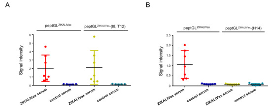 Immunoreactivity of peptGLZIKALIVax mutants with anti-ZIKALIVax immune serum. The O.D450 or signal intensity of individual anti-ZIKALIVax immune sera in relation to peptGLZIKALIVax and its mutants at positions 8 and 12 (A) or 14 (B) measured through peptide-based ELISA. Peptides at concentration of 3 µg mL−1 were incubated with individual anti-ZIKALIVax immune sera (n = 7) (ZIKALIVax serum) showing the higher reactivity with peptGLZIKALIVax at dilution 1:200 (Figure 2B). Serum of mice (n = 7) that received heat-inactivated ZIKALIVax at dilution 1:200 served as a control serum. Each closed circle represents an individual mouse.