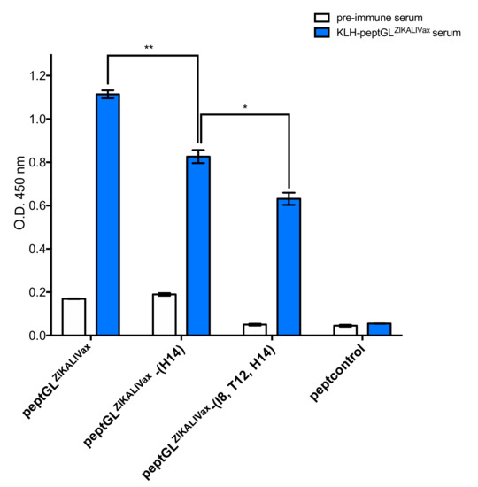 KLH-peptGLZIKALIVax immune serum reacts with peptGLZIKALIVax. The O.D.450 or signal intensity of mouse pre-immune and KLH-peptGLMR766 immune serum S1-RE (KLH-peptGLMR766 serum) at dilution 1:200 in relation to peptGLZIKALIVax and mutant peptides through peptide-based ELISA. Peptcontrol was used as a negative peptide control. The results are the mean (±S.D.) of three repeats. Statistical values correspond to differences between peptides. Pairwise comparisons were performed and statistically significant comparisons are shown as ** p < 10−3, * p < 10−2.