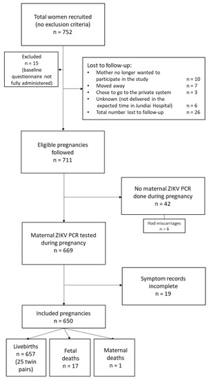 A flow diagram of study participants is shown in Figure 1. A total of 752 women were initially enrolled in the study between March 2016 and August 2017; 26 were eventually lost to follow-up. The women with missing data pertaining to risk factors and outcomes of interest were also excluded. Forty two women did not have a ZIKV RT–PCR sample taken during pregnancy. Additionally, 19 women did not have information on symptoms during pregnancy. Among the remaining 650 women, there were 675 live births (including 25 twin pairs), 17 fetal deaths, and one maternal death.