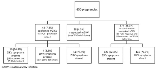 Of the 650 pregnant women in the final cohort, 32 (4.9%) were recruited in the first trimester, 228 (35.1%) in the second trimester, and 378 (58.1%) in the third trimester. In addition, 48 (7.4%) were ZIKV-positive according to the RT–PCR, 28 (4.3%) were positive by the WHO criteria but were ZIKV-negative, and 574 (88.3%) were negative according to both the RT–PCR and symptoms (Figure 2).
