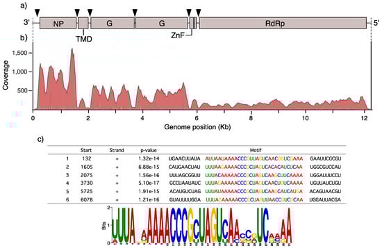 Aedes albopictus anphevirus (AealbAV) genome organization and conserved motif. (a) Genomic organization of AealbAV. Predicted ORFs are indicated with boxes. Positions of the 31-nt conserved motif are indicated by triangles. NP, nucleoprotein; TMD, Transmembrane domain; G, glycoproteins; ZnF, zinc-like finger; RdRP, RNA-dependent RNA polymerase. (b) Example of a mapping profile from 1 library (SRR458463) displaying the characteristic 3′–5′ transcription gradient typical of replicating monenegaviruses. (c) Sequences and logo of the 31-nt conserved motif as estimated by MEME.