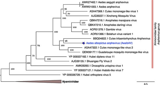 Phylogenetic analysis was performed using the RNA-dependent RNA polymerase (RdRp) proteins of AealbAV and representatives of the Xinmoviridae and Nyamiviridae viral families. The sequences were aligned using MAFFT v7.450 (https://mat.cbrc.jp/alignment/server/) [] employing the G-INS-i algorithm, and trimmed with trimAL v3.4.1 [] with option “-automated1”. The best-fit amino acid substitution model was estimated with ProtTest v3.4.2 [] (-S 2 -all-distributions). Maximum likelihood phylogenetic tree was computed with IQ-TREE v1.6.10 [] with 1000 bootstrap resampling. Phylogenetic tree was drawn with FigTree v1.4.4 (http://tree.bio.ed.ac.uk/software/figtree/) and annotated in Inkscape (https://inkscape.org/).